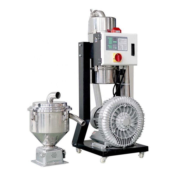 The hopper dryer collects the material for the preheating process that removes the moisture content from the pellets.